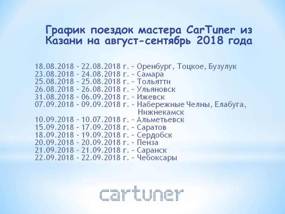 График поездок мастера CarTuner из Казани на август-сентябрь 2018 года