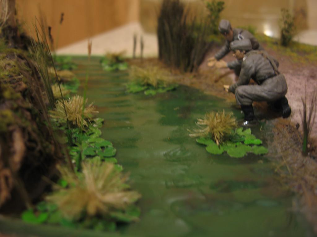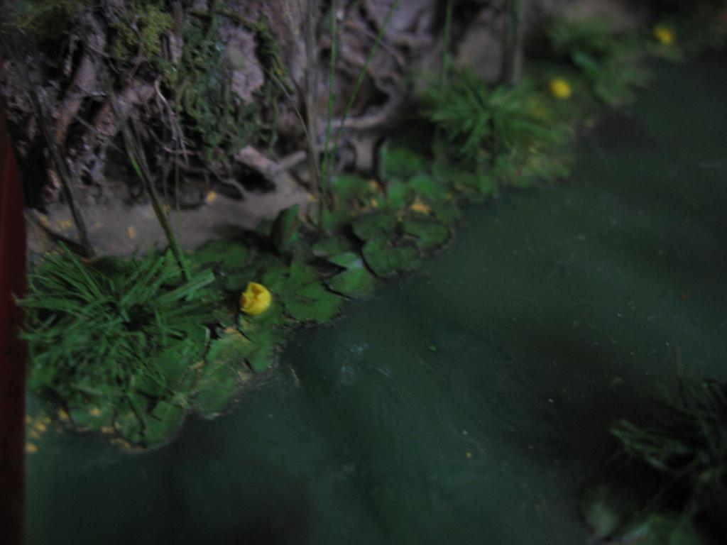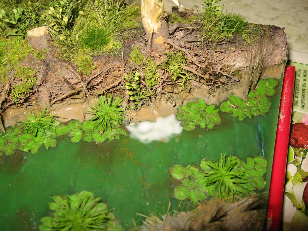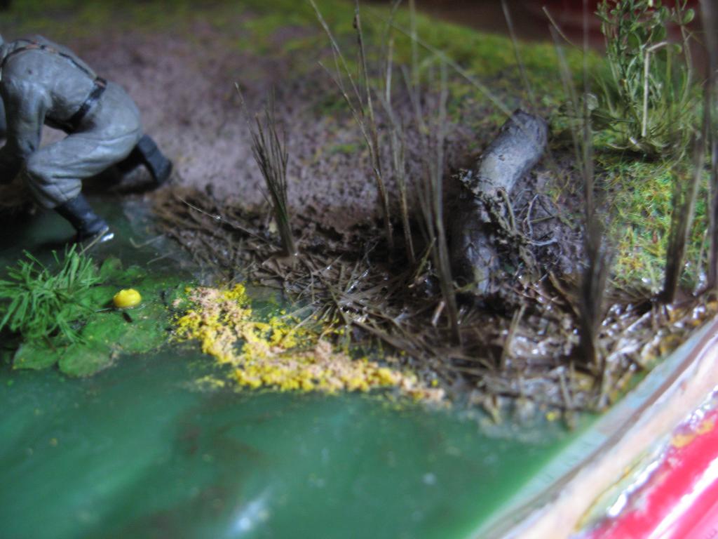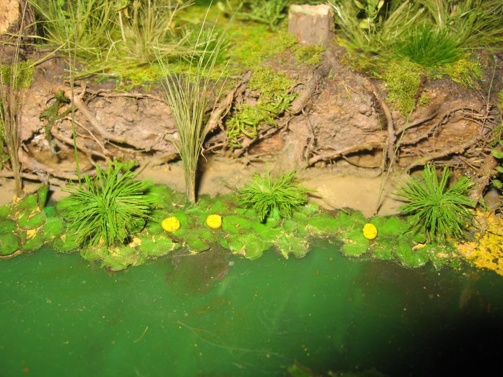 Вложение 18012Вложение 18013Вложение 18014Вложение 18015Вложение 18016Вложение 18017Вложение 18018Вложение 18019А я пока насажал кувшинок. Делал их из жёлтого пластилина. Скатывал шарик и на кончике зубочистки переносил на диораму, приклеивая на секундный клей. Потом уже зубочисткой формировал на цветках некое подобие лепестков. Ещё попробовал "замочить" грязь глянцевым лаком "Ревелл". Опыты по смачиванию грязи видны на двух последних фотографиях.