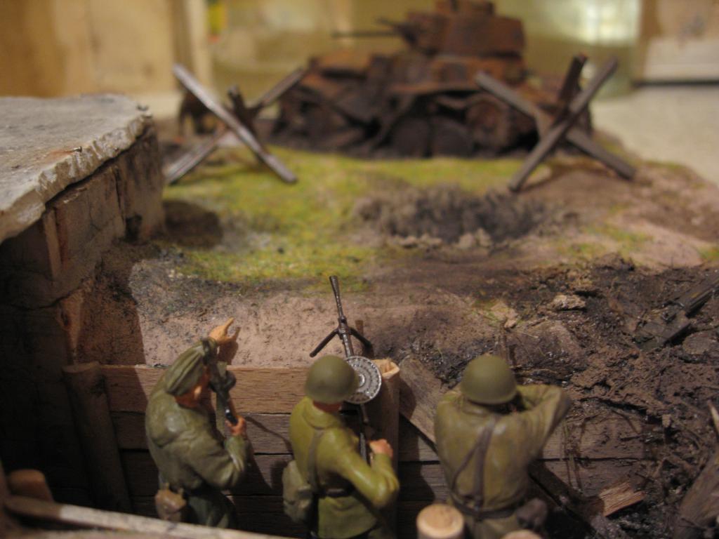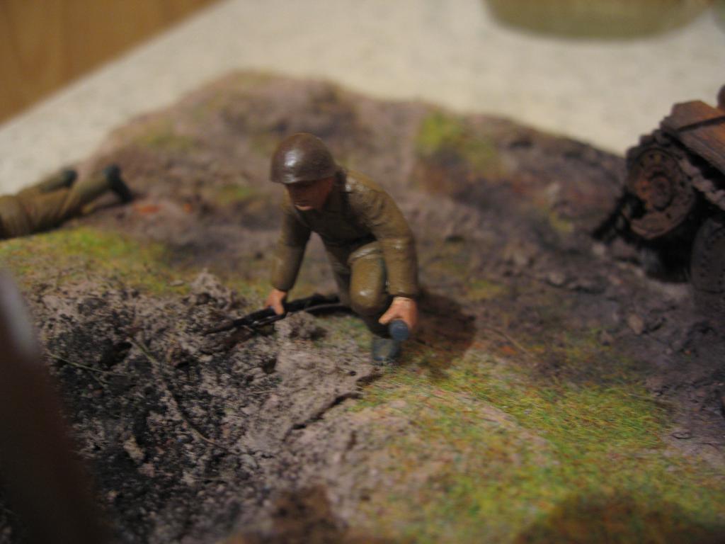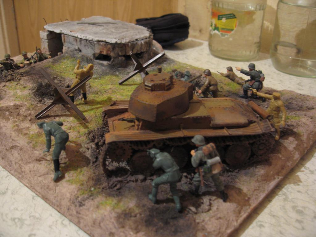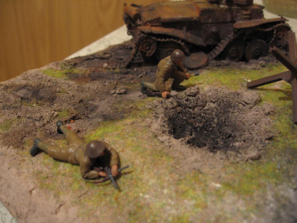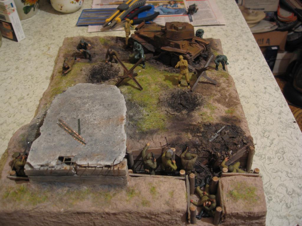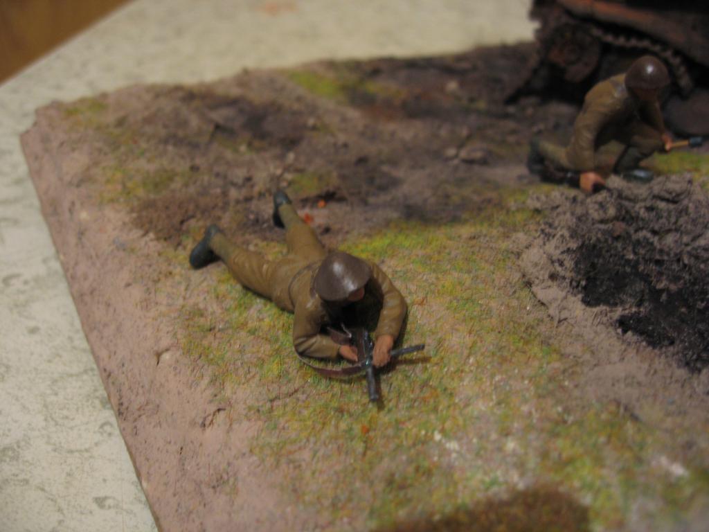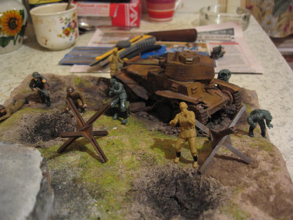 Немного даже жаль, что диорама маловата, а то можно было бы немецкий Кюбельваген штабной туда, с офицерами, которые подъехали слишком близко к советским позициям, при инспекции участка румынского наступления. Значит, логично, чтобы они за танком подбитым прятались, например