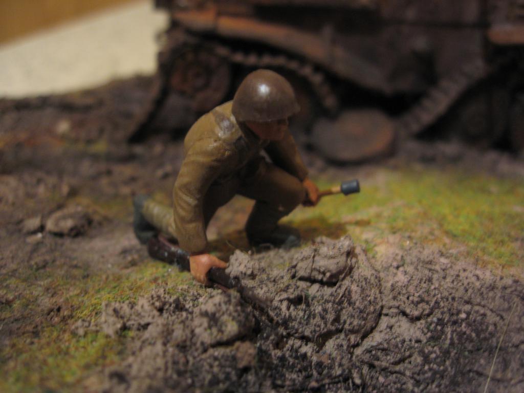 Вложение 19890Вложение 19891Вложение 19892Вложение 19893Вложение 19894Собрал ещё несколько оккупантов и примерно расставил их на диораме. Они ещё не покрашены, но те, кто в обмотках из чёрной изоленты - это румыны. Остальные - немцы. За танком прячется немецкий пулемётчик, у которого МГ-34 будет сошками облокачиваться на танк. Завтра начну понемногу покраску. Кстати, те румыны, которые уже покрашены и приклеены к диораме, тоже ещё запылятся-загрязнятся и им ещё приклею какое-то снаряжение.